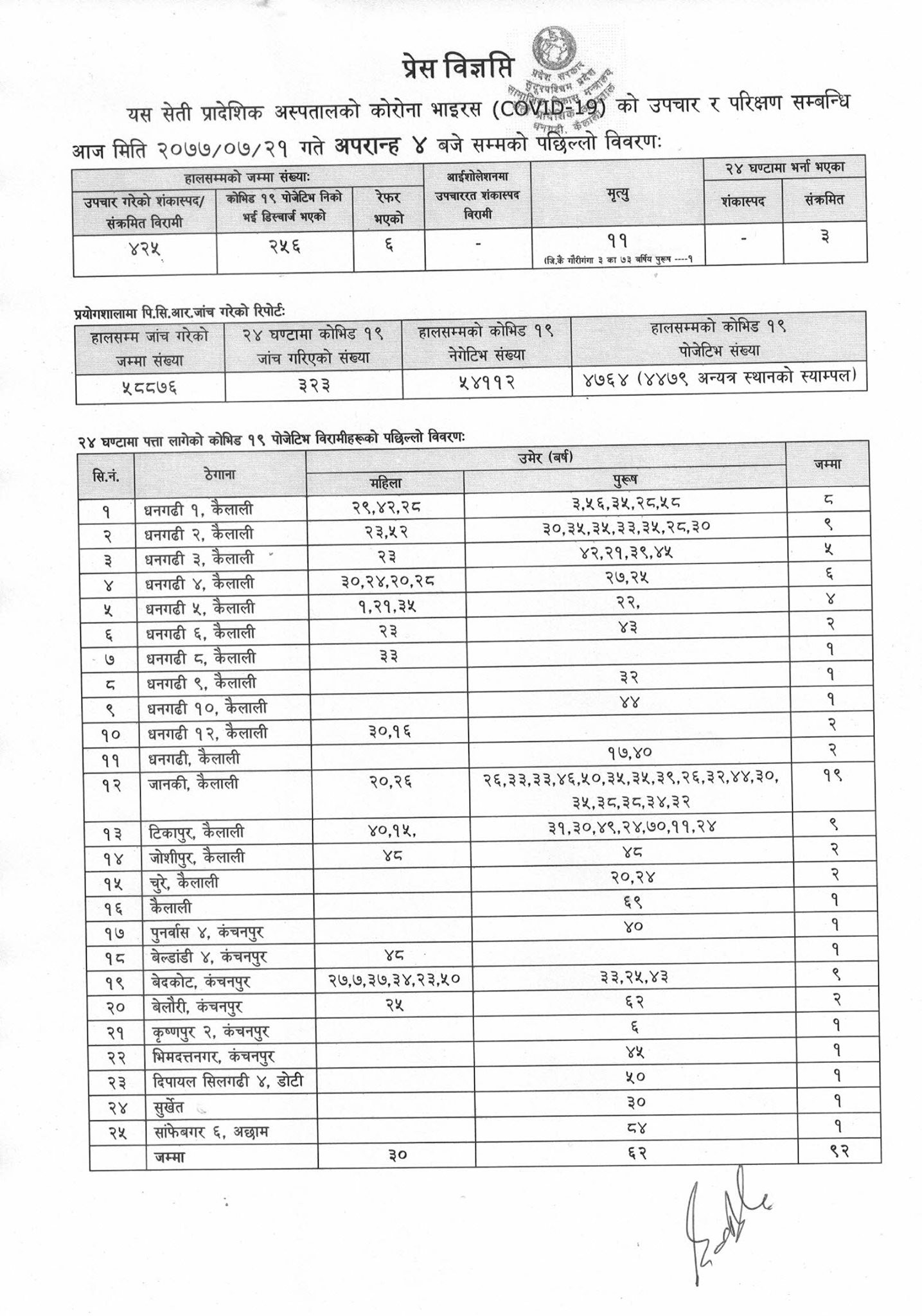 कञ्चनपुरकै भीमदत्त नगरपालिका, पुनर्वास नगरपालिका, बेल्डाडी गाउँपालिका, कृष्णपुर नगरपालिकाका १/१ जना, डोटीको दिपायल सिलगढी नगरपालिका, अछामको साफेबगर नगरपालिका र सुर्खेतका १/१ जनामा पनि संक्रमण पुष्टि भएको हो । ।