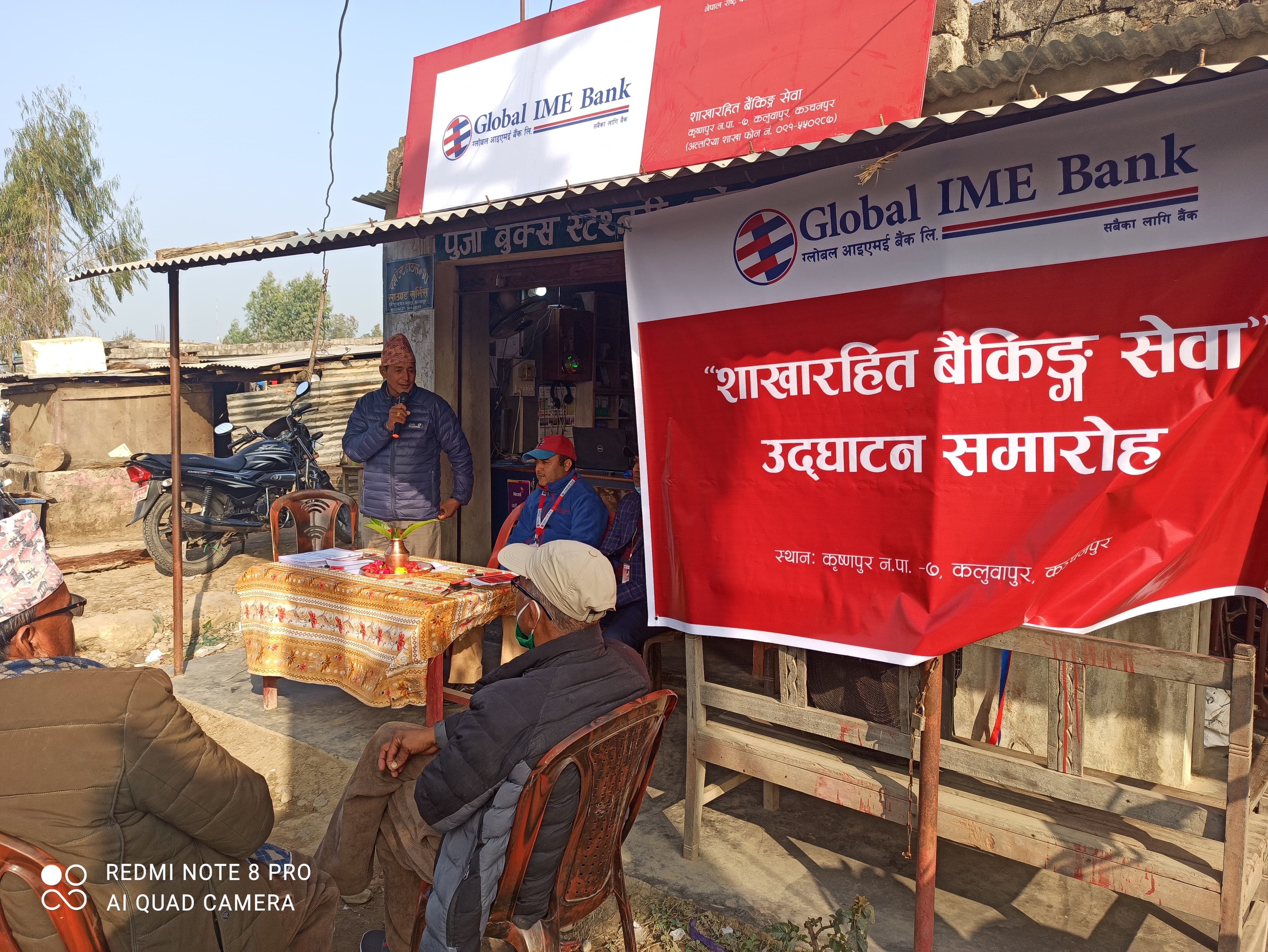 बैंकले कञ्चनपुर जिल्ला कृष्णपुरनगरपलिका वडा नं। ७, कलुवापुर बजारमासञ्चालनमाल्याएको शाखारहित बैंकिङ्ग सेवाको उद्घाटन कलुवापुर बजार ब्यवस्थापन समितिका अध्यक्ष तथा समाजसेवीश्री हरि बहादुर गैराल तथा ग्लोबल आइएमई बैंक लिमिटेड सुदुर पश्चिम प्रमुख मुकुन्द प्रसाद भट्टले संयुक्त रुपमा गर्नुभएको थियो ।