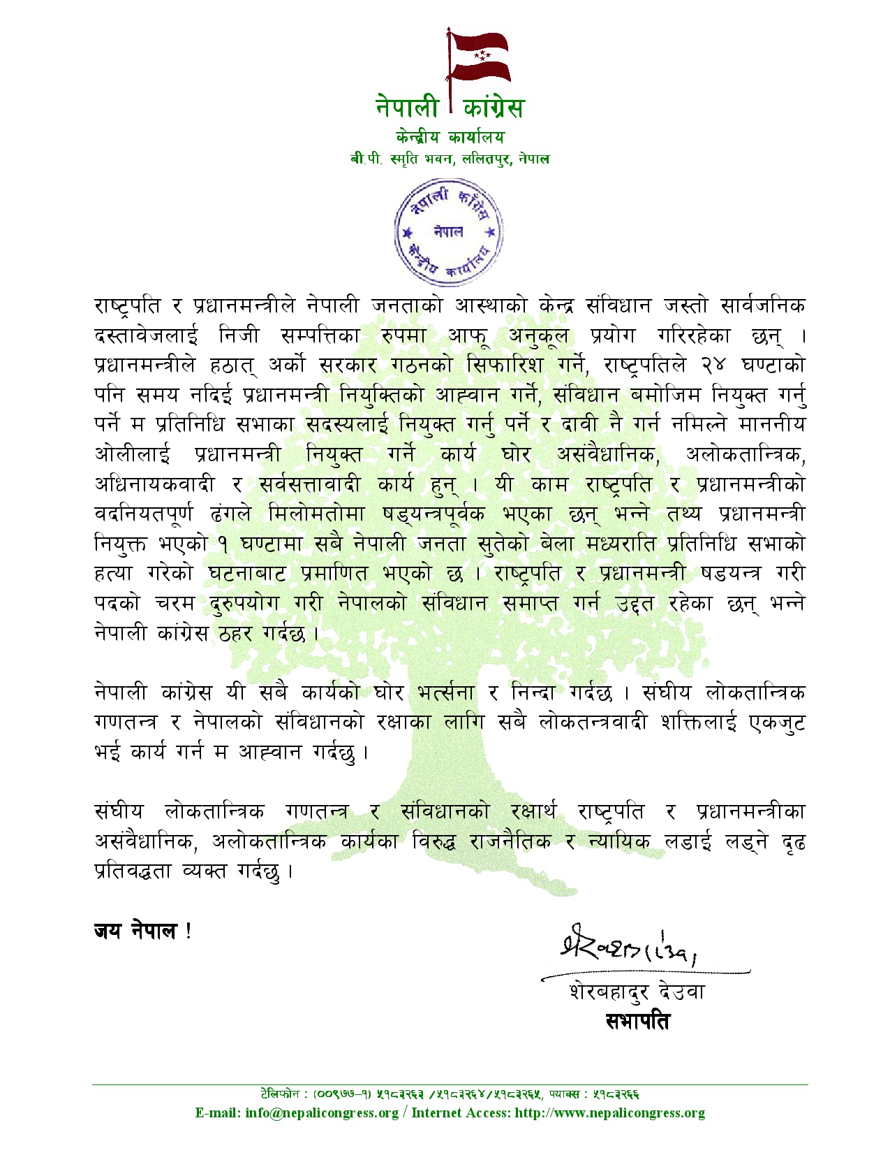‘राष्ट्रपति र प्रधानमन्त्रीको वदनियतपूर्ण ढंगले मिलोमतोमा षड्यन्त्रपूर्वक भएका छन् भन्ने तथ्य प्रधानमन्त्री नियुक्त भएको १ घण्टामा सबै नेपाली जनता सुतेको बेला मध्यराति प्रतिनिधिसभाको हत्या गरेको घटनाबाट प्रमाणित भएको छ,’ देउवाले भनेका छन् ।