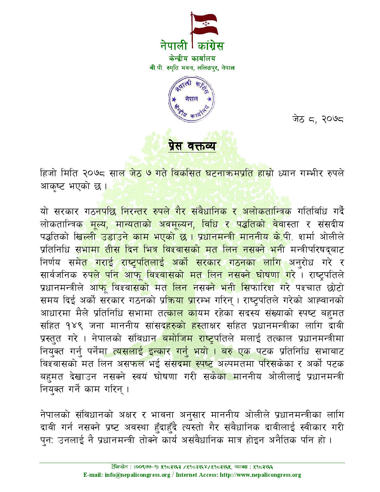देउवाले नेपालको संविधानको अक्षर र भावना अनुसार ओलीले प्रधानमन्त्रीका लागि दाबी गर्न नसक्ने प्रष्ट अवस्था हुँदाहुँदै गैर संवैधानिक दाबीलाई स्वीकार गरी पुनः उनलाई नै प्रधानमन्त्री तोक्ने कार्य असंवैधानिक र अनैतिक भएको पनि बताएका छन् ।