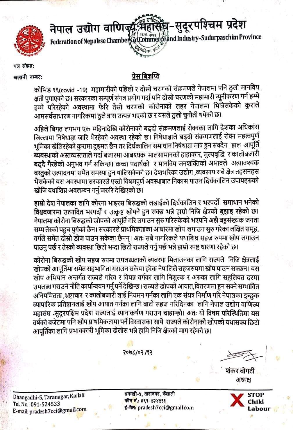 नेपाल उद्योग वाणिज्य महासंघ सुदुरपश्चिम प्रदेशका अध्यक्ष शंकर बोगटीको हस्ताक्षर रहेको विज्ञप्तिमा खोप आयात गर्दा हुन सक्ने सम्भावित कालोबजारी, भष्ट्रचार र अनियमितता बारे पनि सरकारलाई ध्यानाकर्षण गराएको छ ।