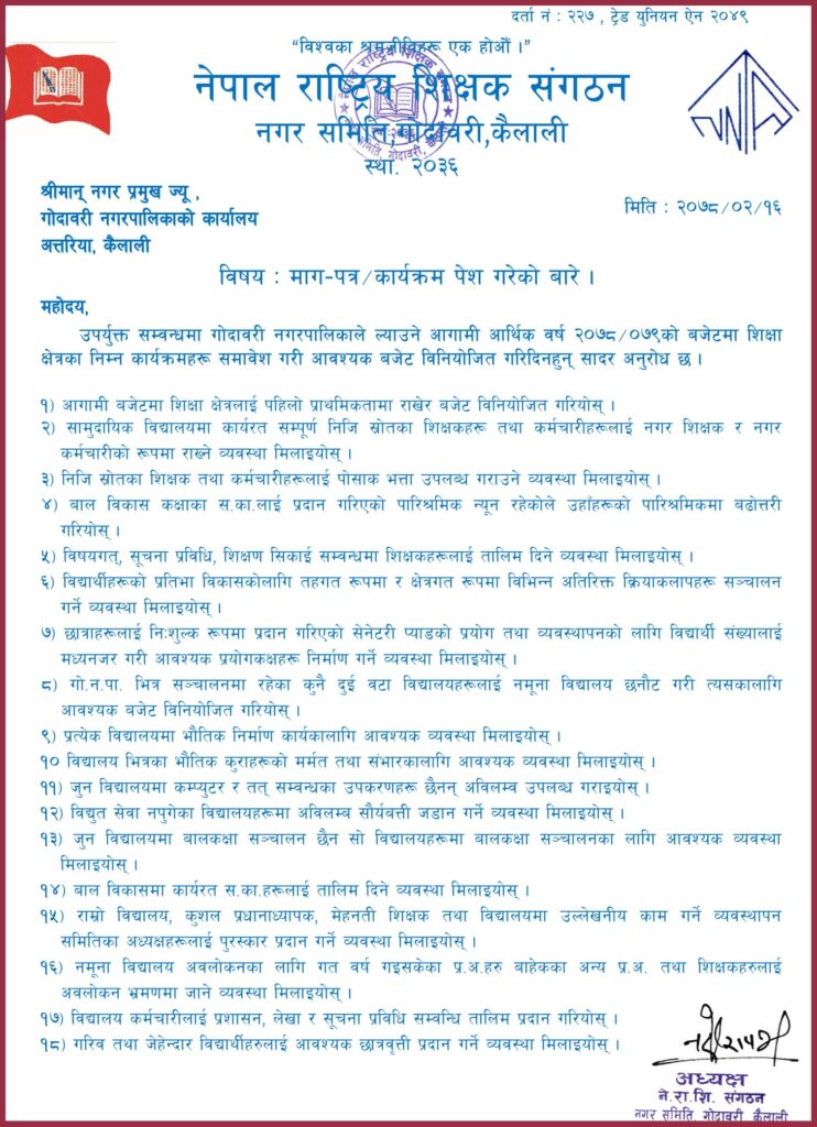 शिक्ष संगठनले पेश गरेको उक्त पत्रमा गोदावरी नगरको शिक्षा क्षेत्रको विकासका लागि बिभिन्न १८ बुदे माग राखिएको छ । जसको पहिलोमा आगामी बजेटमा शिक्षालाई पहिलो प्राथमिकतामा राखेर बजेट बिनियोजन गर्न अनुरोध गरिएको छ ।