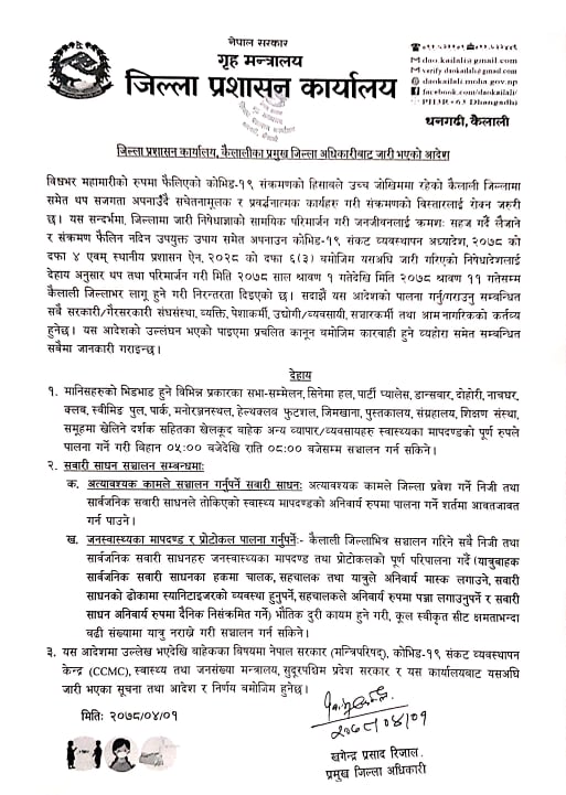 जिल्ला प्रशासन कार्यालय कैलालीले कोरोनाको संक्रमण दर कम हुदै जादाँ बिस्तारै निषेधाज्ञा पनि खुकुलो बनाउदै लगेको छ ।