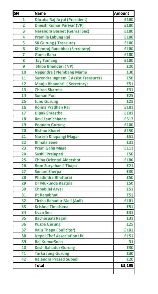 सहयोग संकलनको संयोजन शाखाका वरिष्ठ उपाध्यक्ष दिनेशकुमार परियार, उपाध्यक्ष प्रमिला लावुङ राई र कार्यसमिति सदस्य गोमा रानाले गरेका थिए । नेपाल पत्रकार महासंघ बेलायतका अध्यक्ष ध्रुवराज अर्यालले महामारीका बेला अफ्टेरोमा परेका सहकर्मीको हौसला बढाउने उद्धेश्यले सहयोग पठाइएको बताए।