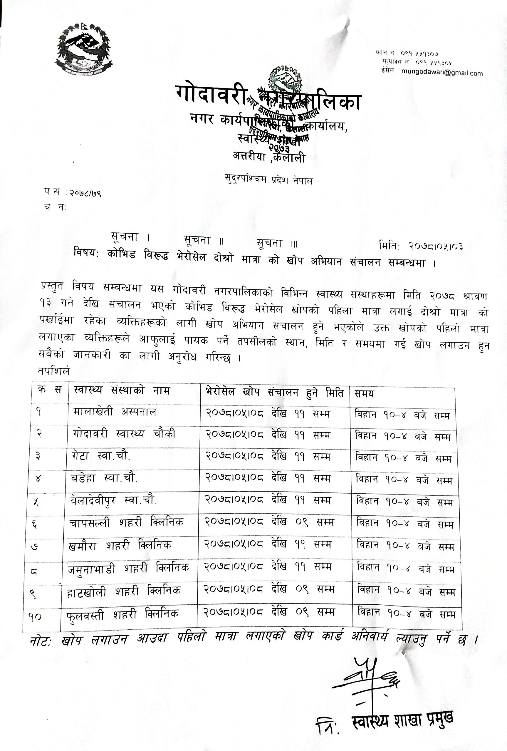 यस्तै मालाखेती अस्पताल , गोदावरी स्वास्थ्य चौकी , गेटा स्वास्थ्य चौकी , बडेहा स्वास्थ्य चौकी , बेलादेवीपुर स्वास्थ्य चौकी , चाप सल्ली शहरी क्लनिक , खमौरा शहरी क्लिनिक , जमुनाभाडी शहरी क्लिनिकमा भदौ ८ गतेदखी ११ गते सम्म खोप लगाइने ब्यबस्था मिलाएको नगरपालिकाको स्वास्थ्य शाखाले जनाएको छ । बिहान १० बजेदेखी ४ बजे सम्म खोप लगाउन सकिने छ ।