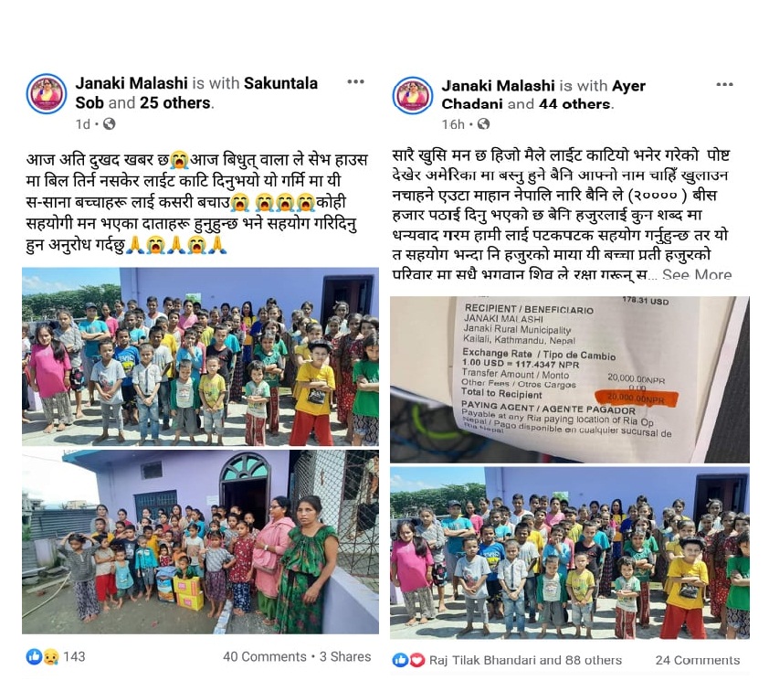 तर भनिन्छ नि जसको कोही छैन उसको उपरवाला हुन्छ । यही क्रममा सबै बालबालिकाहरुको उक्त घाउमा मलम लगाउनका लागि एक महिलले आफ्नो ब्यक्तिगत रुपमा सहयोग गरेकी छन् । अध्यक्ष मलासीले हालेको फेसबुक स्टाटसलाई हेरेर बिदेशमा रहेकी एक जना नेपाली महिलाले तुरुन्त बिधुत प्राधिकरणलाई तिनुपर्ने रु २० हजार पठाएर सेभ हाउसलाई ठूलो गुन लगाएकी छन् ।