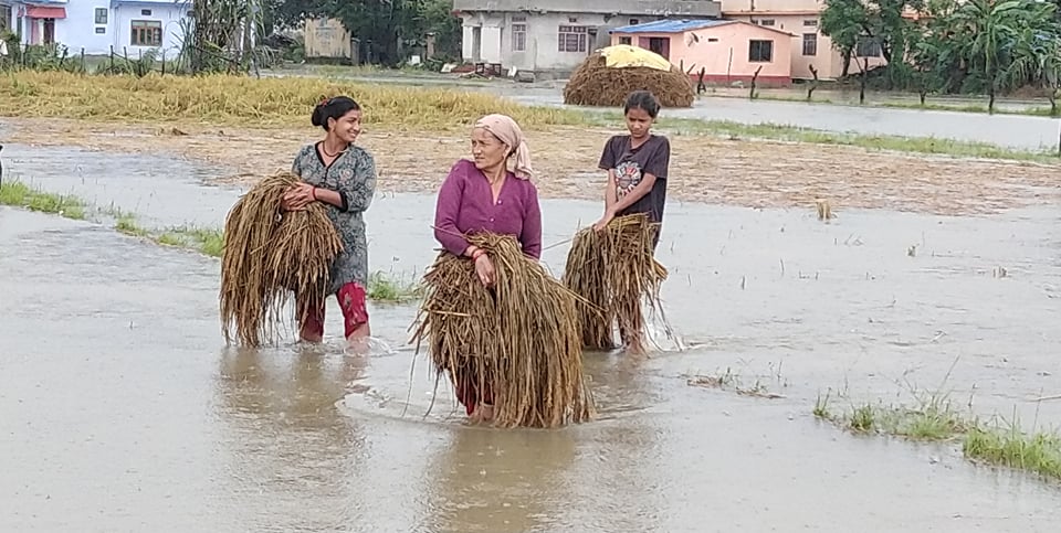 कैलालीको गोदावरी नगरपालिका वडा न २ तेघरीकी जानकी बि.कले पाकेर लटरम्म भएको धान काटेर सुकाएको बेला एक्कासी आएको बर्षाले बर्षभरीको सबै मेहेनत पानीले बगाएर लगेको दुखेसो पोखिन् ।