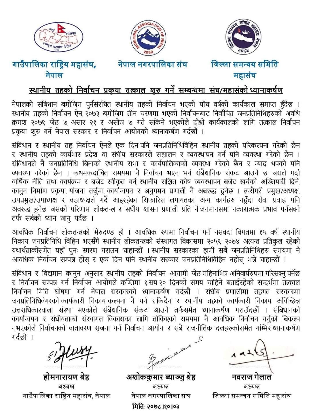 गाउँपालिका राष्ट्रिय महासंघका अध्यक्ष होमनारायण श्रेष्ठ, नगरपालिका संघका अध्यक्ष अशोककुमार ब्याञ्जु श्रेष्ठ र जिसस महासंघ अध्यक्ष नवराज गेलालले आज निकालेको विज्ञप्तिमा तोकिएको समयमा नै आवधिक निर्वाचन गरिनुपर्ने बताएका हुन्।