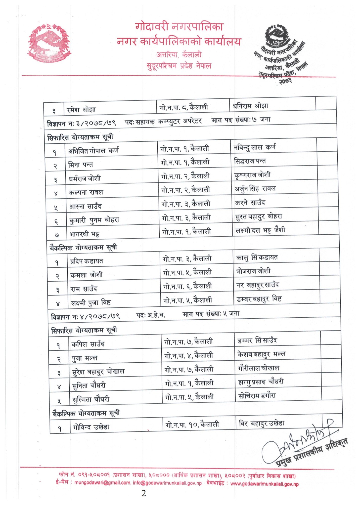 नगरपालिकाले मागेको कर्मचारीहरुमा सबै भन्दा बढी सहायक कम्युटर अपरेटरका लागि आवेदन परेको थियो । नगरपालिकाले ७ जना सहायक कम्युटर अपरेटर माग गरेकोमा ३ सय ९८ जनाले आवेदन फाराम भरेका थिए ।