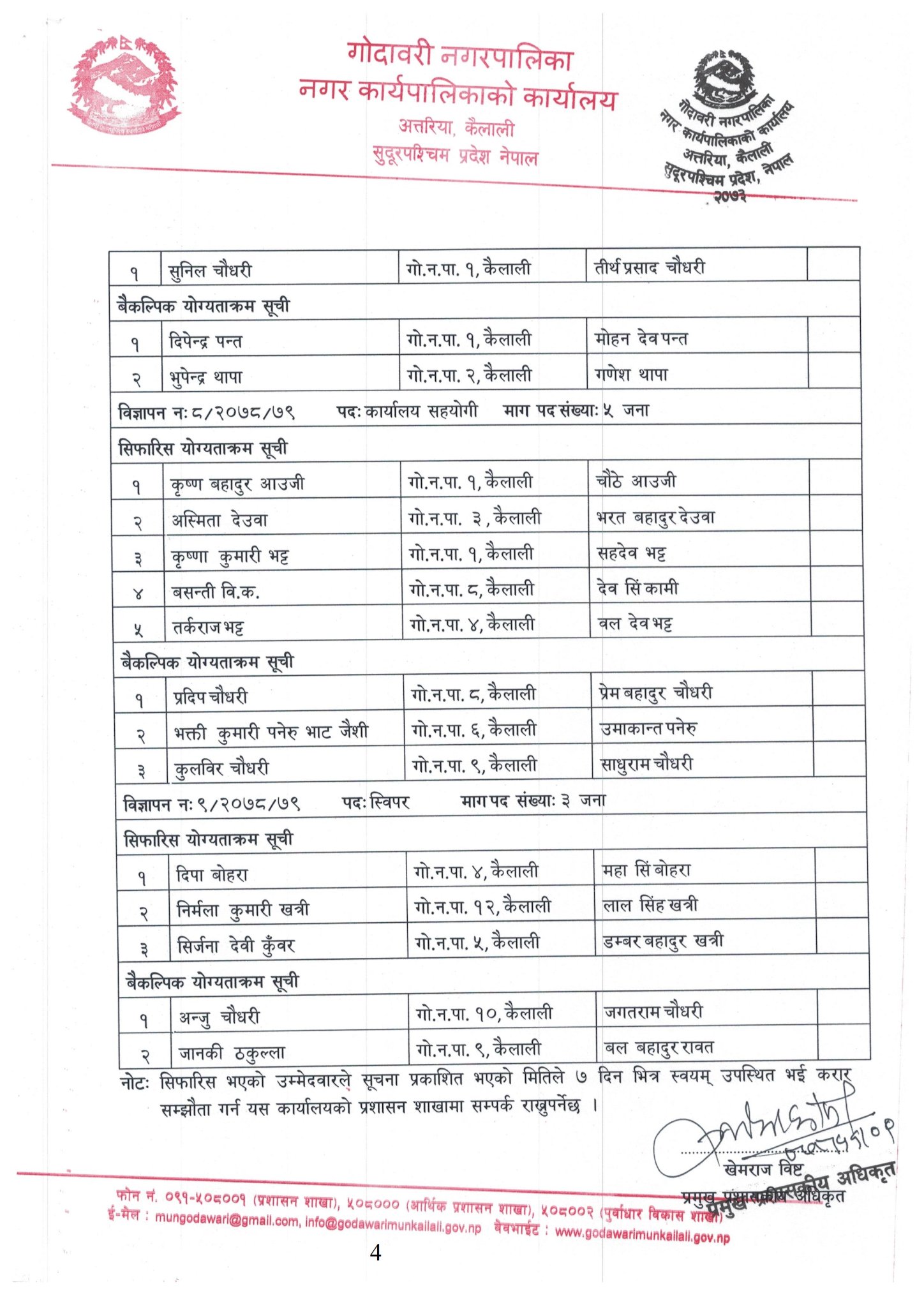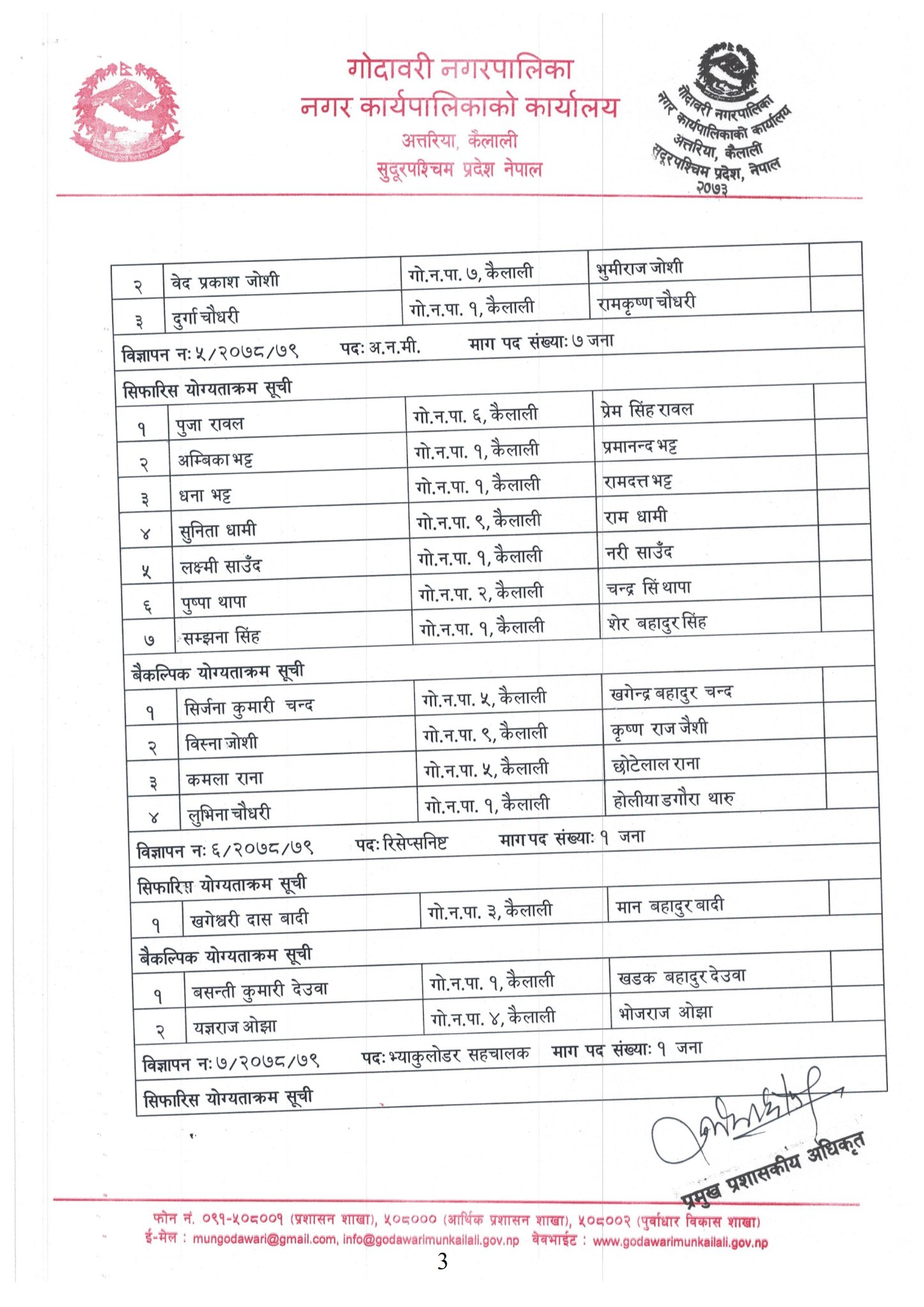 त्यसपछि सर्टलिष्टमा परेकाहरुको प्रयोत्मक परीक्षा र अन्र्तवार्तावाट छनौट भएका ३५ जनाको नाम आज सार्वजनिक भएको हो । नगरपालिकाले ०७८ साल पौष मसान्त सम्म काम गर्ने अबधि राखेर बिभिन्न ९ पदका लागि २०७८ साउन ४ गते ३५ जना कर्मचारी माग गर्दै आवेदन दिन आह्वान गरेको थियो । तर काम गर्ने अबधि सकिएको एक महिनापछि आज कर्मचारीहरुको टुगाें लगाएको हो । नगरपालिकाले फार्मेसी सहायक , रिसेप्सनलिष्ट , ल्याब असिस्टेण्ट , अहेब , अनमी , सहायक कम्युटर अपरेटर , भ्याकु लोडर सह चालक , कार्यालय सहयोगी र स्वीपर माग गरेको थियो ।
