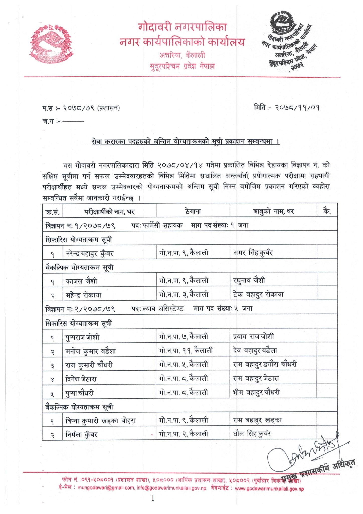 अत्तरिया - कैलालीको गोदावरी नगरपालिकाले करारमा मागेका कर्मचारीहरुको टुङ्गो लगाएको छ । नगरपालिकाले पहिलो पटक ठूलो संख्यामा मागेको स्वास्थ्य तर्फका करारका कर्मचारीहरुको आज अन्तिम टुङ्गो लगाएको हो ।