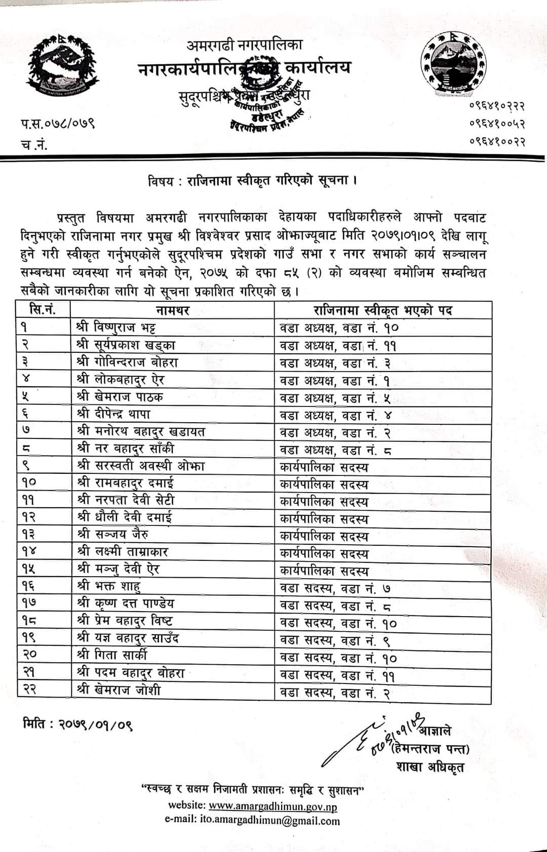 लोकबहादुर ऐर, मनोराथ बहादुर खडायत, गोविन्द बोहरा, दिपेन्द्र थापा, खेमराज पाठक, नरबहादुर साँकी, विष्णुराज भट्ट, सूर्यप्रकाश खड्काले दिएको राजीनामा निमित्त प्रमुख प्रशासकीय अधिकृत हेमन्त पन्तले स्वीकृत गरेका छन्।