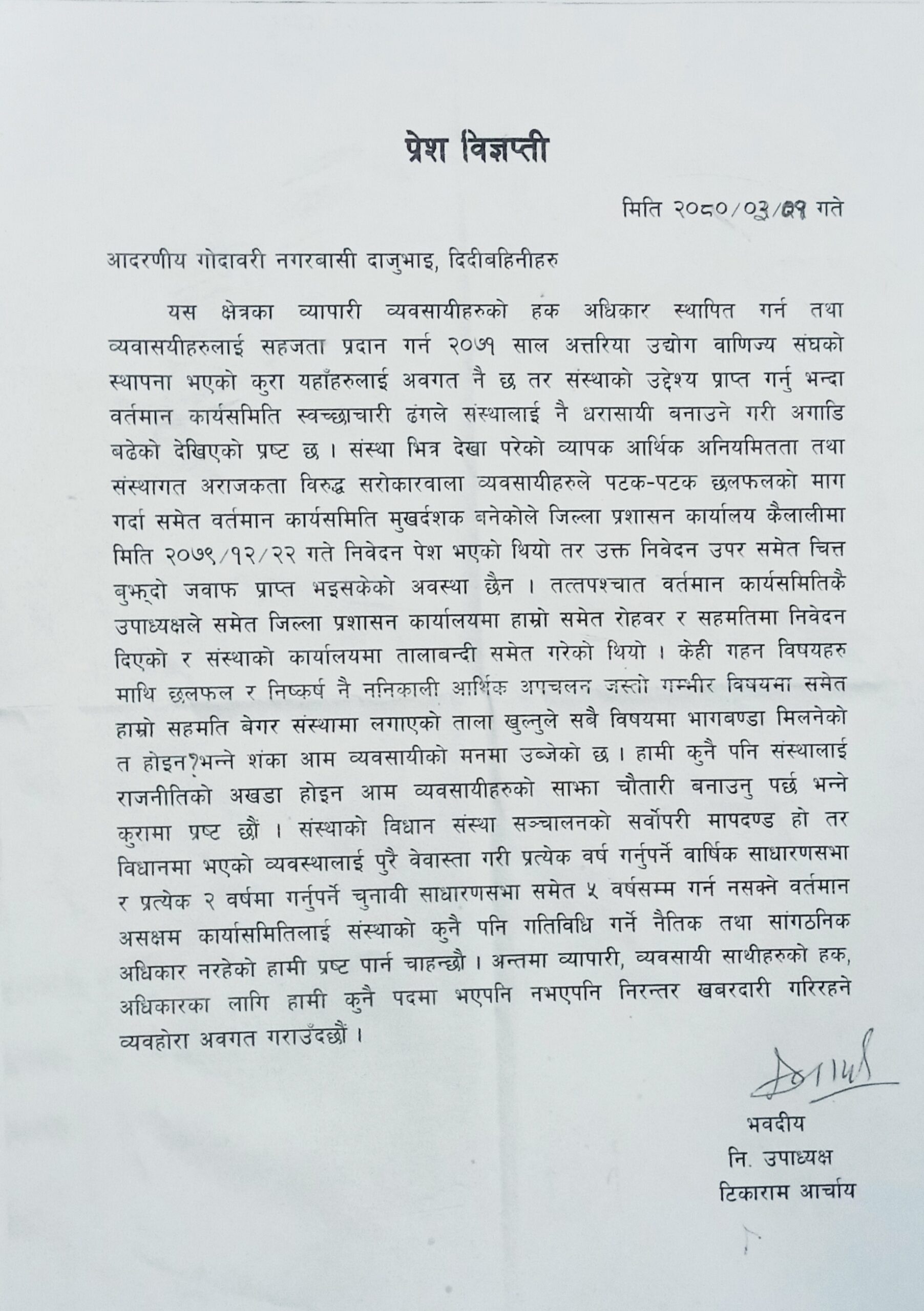 ‘वर्तमान कार्यसमितिले स्वेच्छाचारी ढंगले संस्थालाई नै धरासायी बनाउने गरी अगाडी बढेको देखिएको प्रष्ट छ’ अत्तरिया उद्योग वाणिज्य संघका निर्वतमान उपाध्यक्ष टिकाराज आर्चायद्धारा हस्ताक्षरित विज्ञप्तीमा भनिएको छ ‘विद्यानमा भएको व्यवस्थालाई पुरै वेवास्ता गरी प्रत्येक वर्ष गर्नुपर्ने वार्षिक साधारण सभा र प्रत्येक २ वर्षमा गर्नुपर्ने चुनावी साधारण सभा समेत ५ वर्षसम्म गर्न नसक्ने वर्तमान असक्षम कार्यसमितिलाई संस्थाको कुनै पनि गतिविधि गर्नै नैतिक तथा सांगठनिक अधिकार नरहेको हामी प्रष्ट पार्न चाहन्छौ ।’