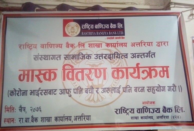 कैलालीको गोदावरी नगरापलिका २ अत्तरियामा रहेको राष्ट्रिय बाणिज्य बैंक लिमिटेड अत्तरिया शाखाले सेवाग्राहीलाई सेवा संगै मास्क वितरण गराउन थालेपछि लुहारले पनि बुधबार बैंकबाट पैसा संगै पाएको मास्क प्रयोग गरेका हुन । उनले मास्क पाएपछि बैकलाई धन्यावाद दिदै खुसी व्यक्त गरे । ‘बैंकको यस कामले धेरैलाई मास्क प्रयोग गर्न उत्प्रेरीत गरेको छ ।’ लुहारले भने –‘यसबाट मास्क किन्न नसक्ने र किन्न नचाहनेलाई मास्क लगाउँनै पर्ने रहेछ भन्ने कुरामा सचेत गरेको छ ।’