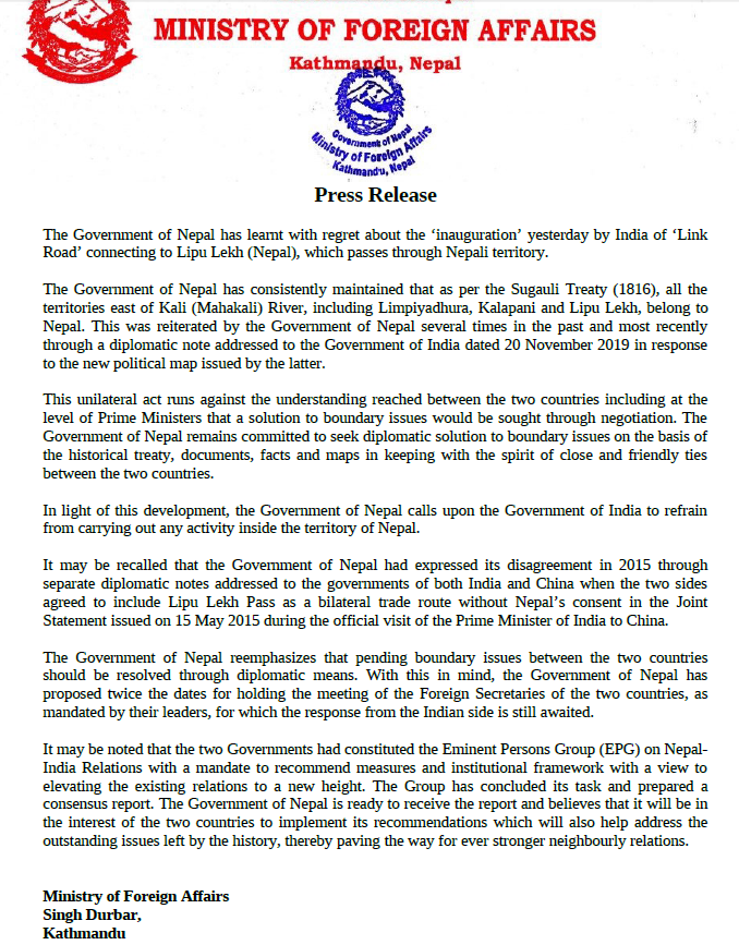 परराष्ट्रले एकपक्षीय कार्य दुई देशहरूबीच भएको समझदारी विरुद्ध रहेको औँल्याउँदै सीमा विवादको समाधान वार्ताबाट खोजिने बताएको छ । सरकार २ देशबीचको घनिष्ठ र मैत्री सम्बन्धको भावना राख्दै ऐतिहासिक सन्धि, दस्तावेज, तथ्य र नक्शाको आधारमा सीमाका मुद्दाहरूको कूटनीतिक समाधान खोज्न प्रतिबद्ध रहेको पनि विज्ञप्तिमा उल्लेख गरिएको छ । ’दुवै सरकारले विद्यमान सम्बन्धलाई नयाँ उचाइमा र्पुयाउने उपाय र संस्थागत रूपरेखा सिफारिस गर्ने जनादेश सहित नेपाल–भारत सम्बन्धमा इमिनेन्ट पर्सन ग्रुप (ईपीजी) गठन गरेको थियो ।