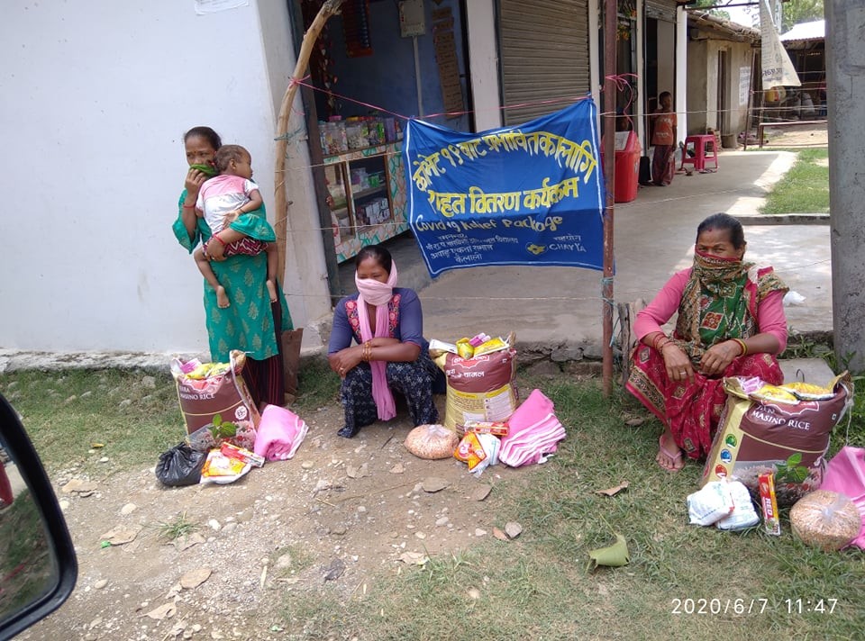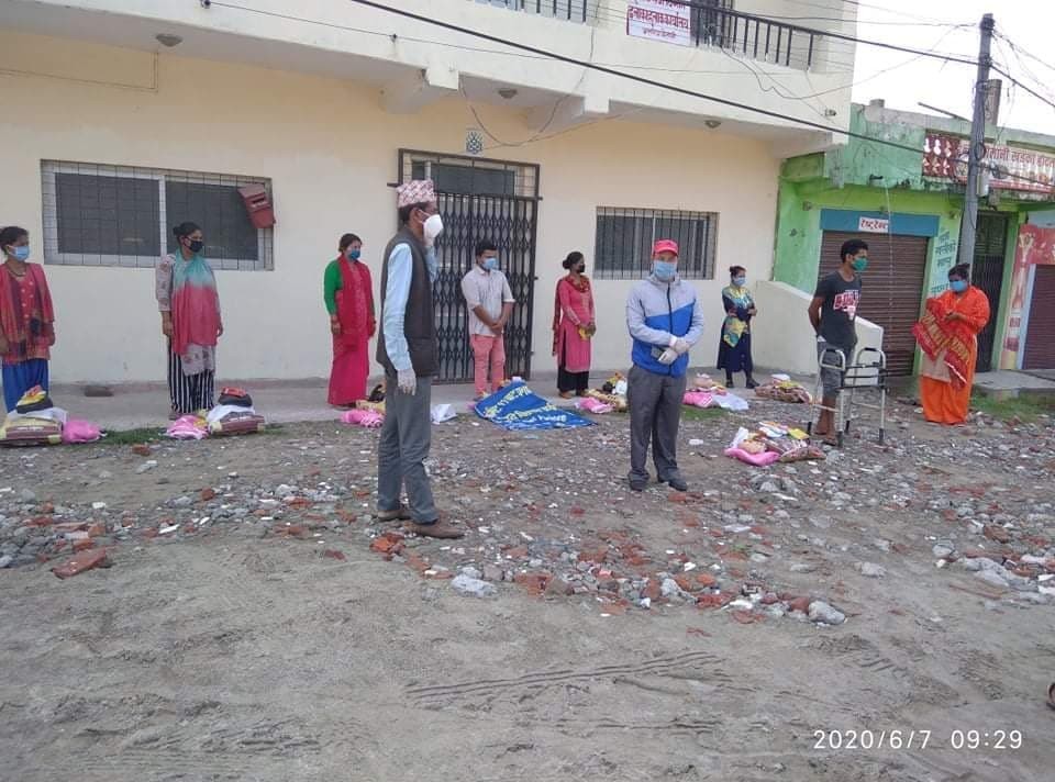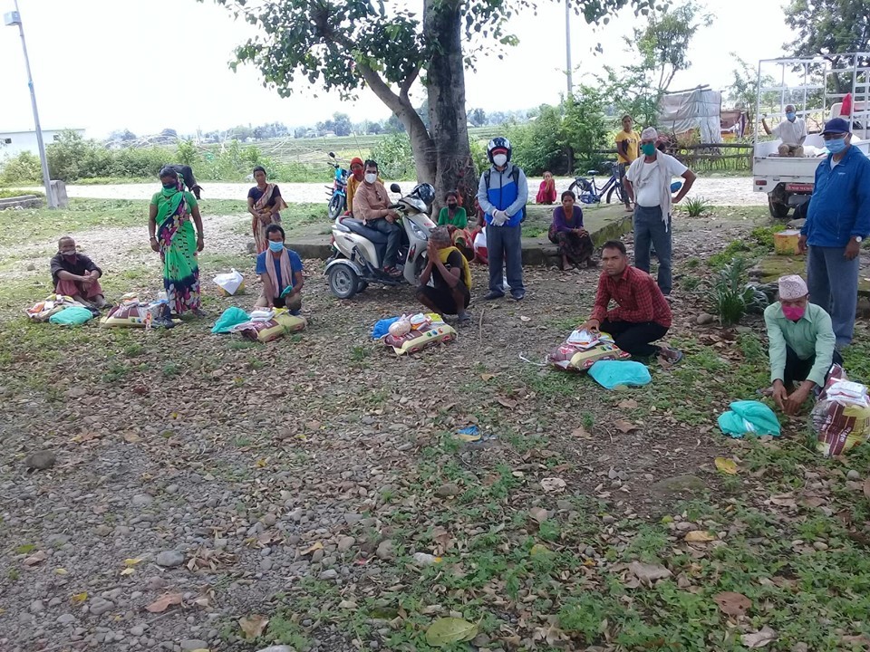 उनीहरुलाई प्रति व्यक्ति २५ किलोग्राम मसिनो चामल, २ किलोग्राम दाल, १ लिटर तेल, २ किलोग्राम नुन, १ टुटपेस्ट, २ साबुन र १ ओटा झुल वितरण गरिएको वितरण कार्यक्रमका संयोजक मान बहादुर साउँदले बताए ।