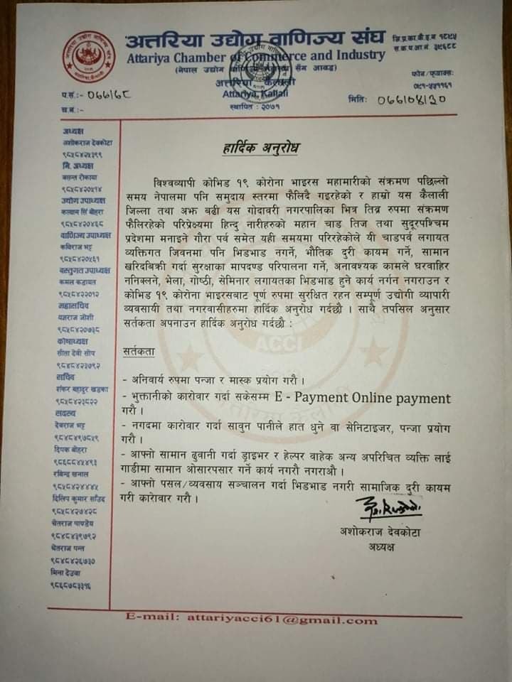 अत्तरिया उद्योग बाणिज्य संघका अध्यक्ष अशोकराज देवकोराद्वारा हस्ताक्षरित अपिलमा भनिएको छ – अनिवार्य रुपमा पन्जा र मास्क प्रयोग गरौं , भुक्तानीको कारोबार गर्दा सकेसम्म अनलाईन बिधि अपनाऔं , नगरमा कारोबार गर्दा सावुन पानीले हात धुने वा सेनिटाईजर, पन्जा प्रयोग गरौं , आफ्नो सामान ढुवानी गर्दा ड्राईभर र हेल्पर बाहेक अन्य अपरिचित ब्यक्तीलाई गाडीमा सामान ओसारपसार गर्ने कार्य नगरौ नगराऔ र आफ्नो पसलरब्यावसाय संचालन गर्दा भिडभाड नगरी सामाजिक दुरी कायम गरी करोबार गरौं ।
